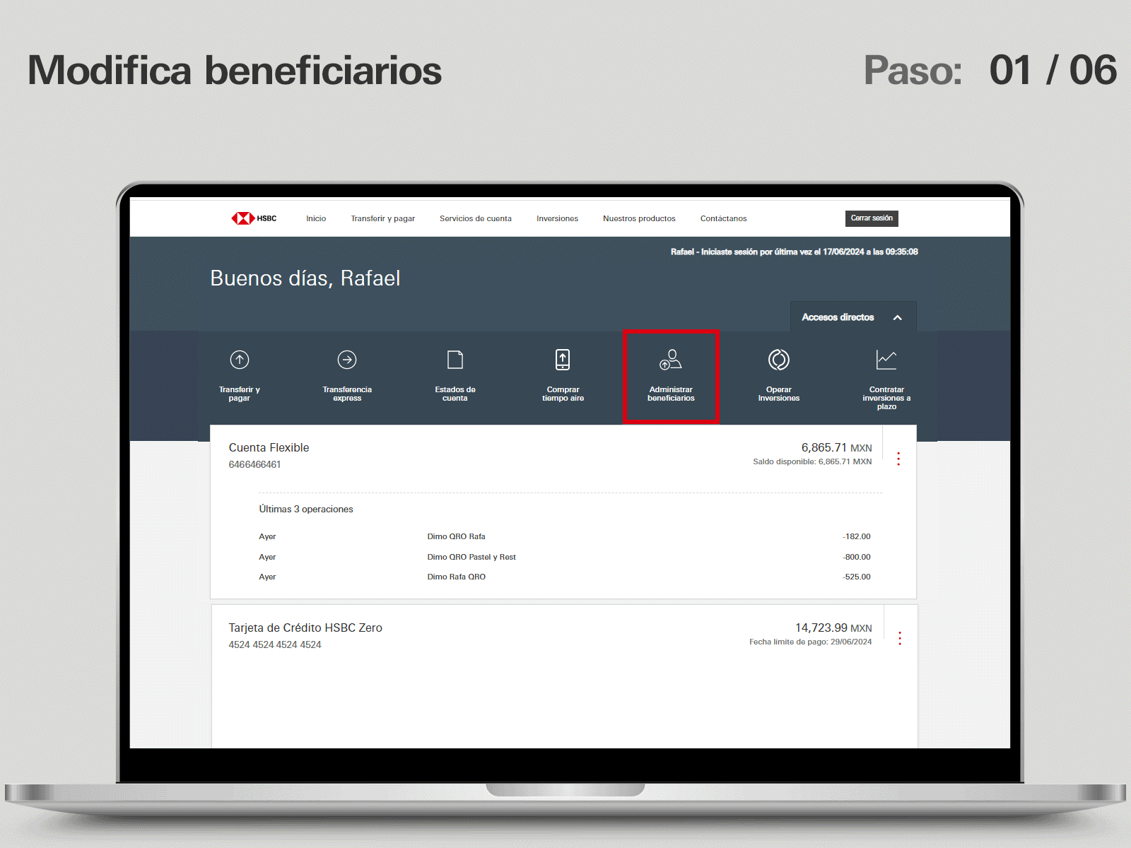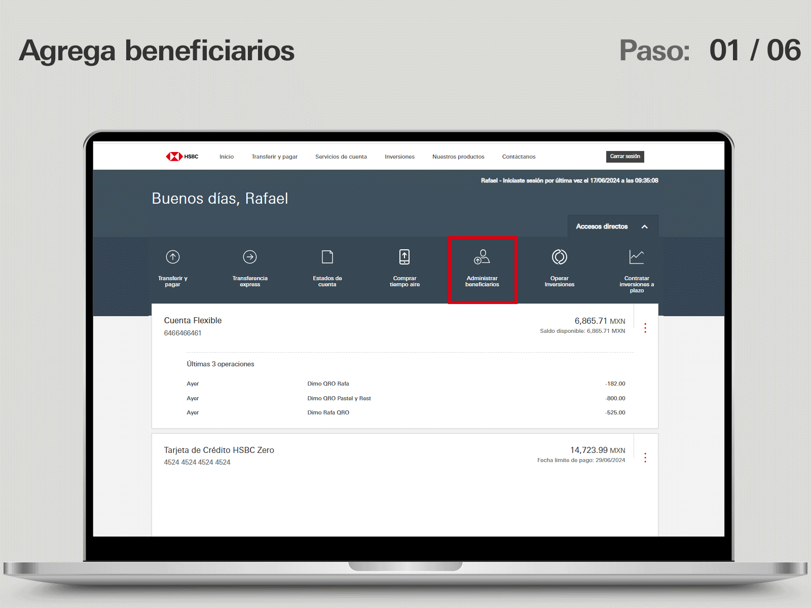 - Ingresa a tu Banca por Internet con tu usuario y contraseña y ve a la opción Administrar beneficiarios.