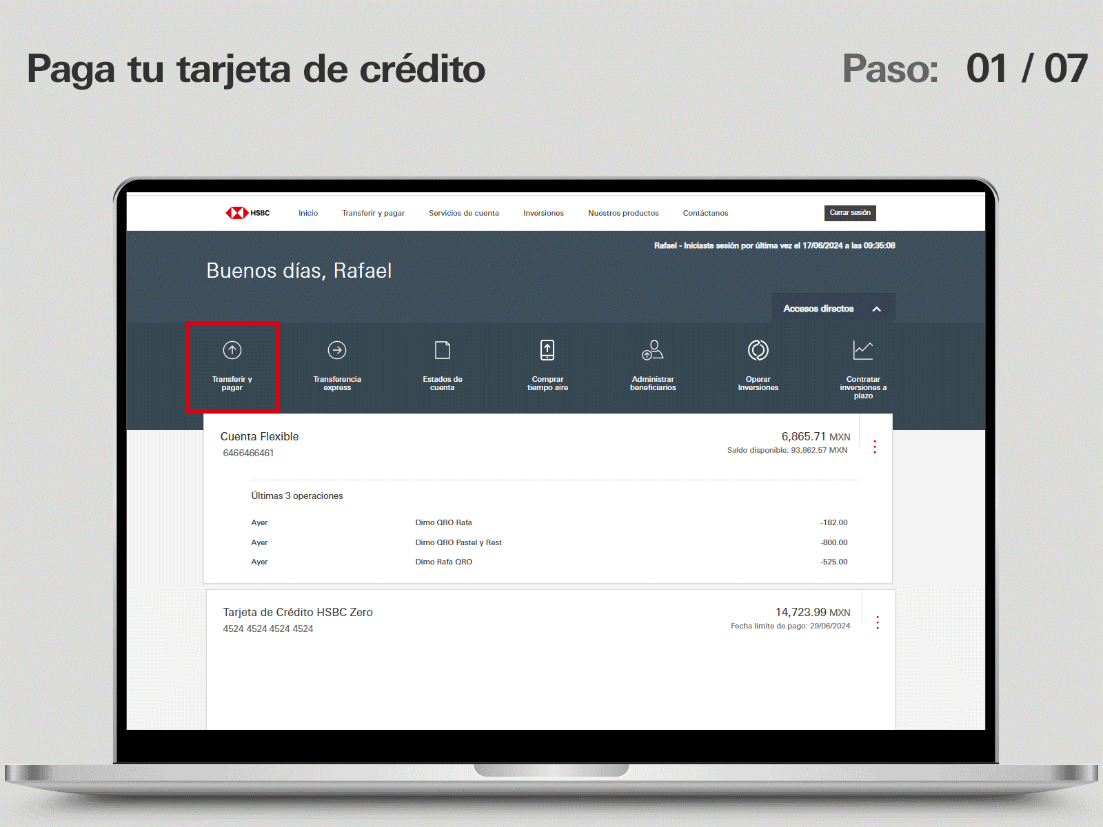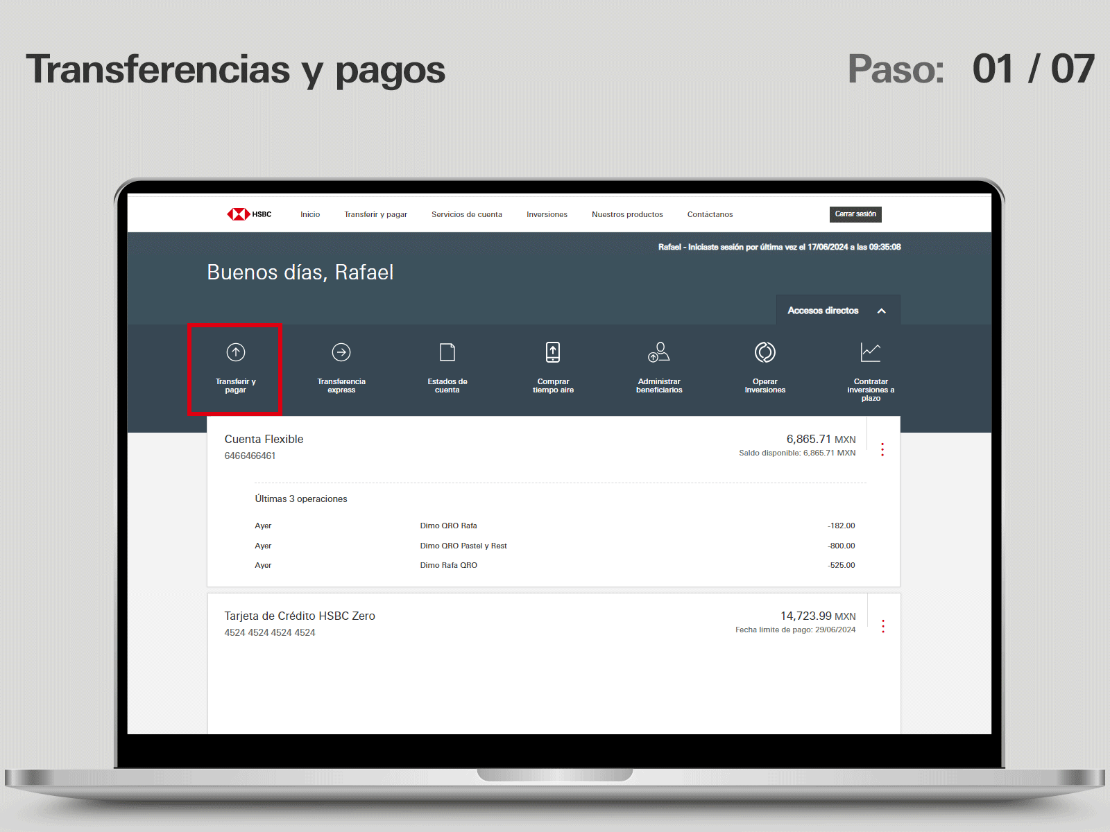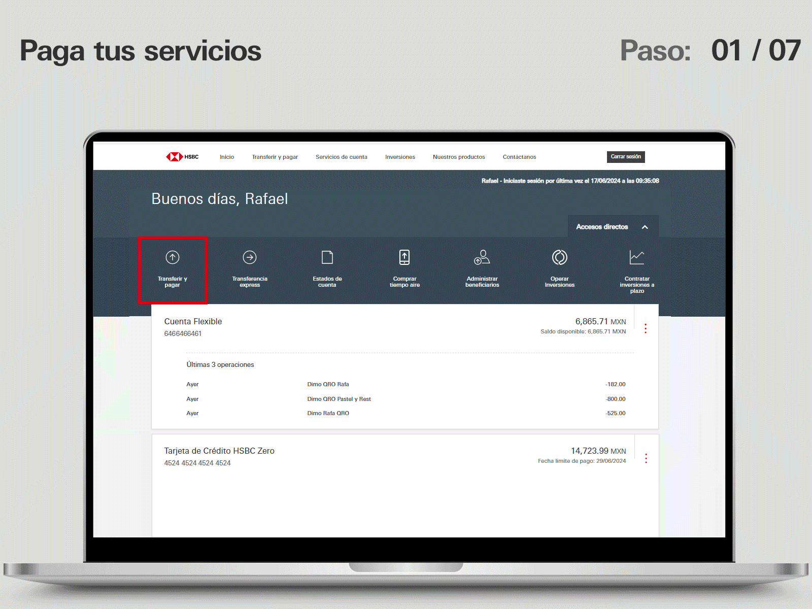 - Si ya diste de alta a tu beneficiario y ya pasó 1 hora, aquí tienes el paso a paso. Ingresa a tu Banca por Internet con tu usuario y contraseña y elige la opción Transferir y pagar.