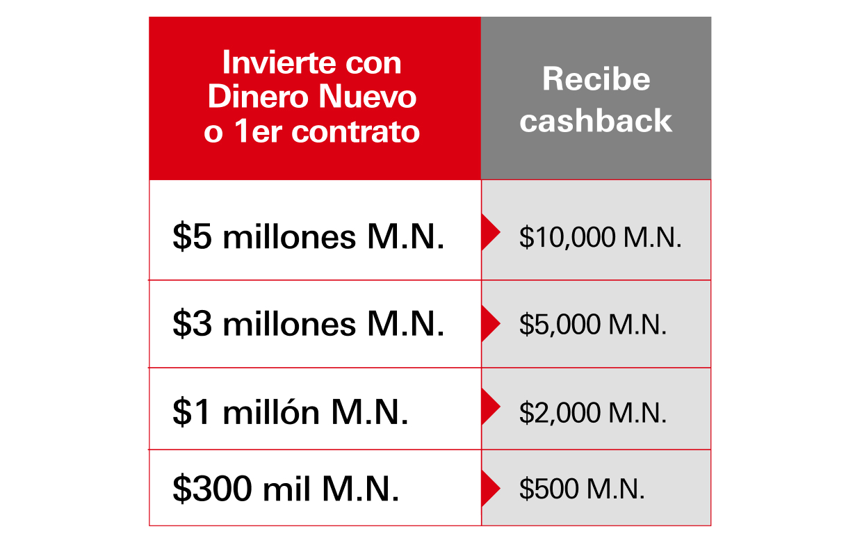 Abre un contrato o incrementa tu Fondo de Inversión desde $1 millón M.N. y además de potenciar tu patrimonio, recibe un cashback de hasta $10,000 M.N.