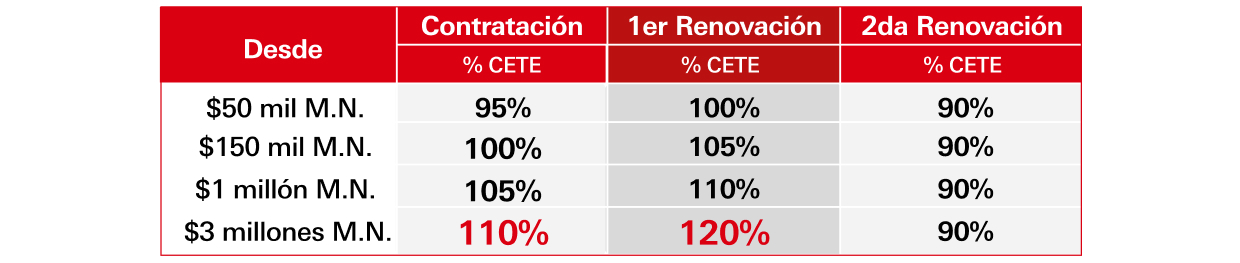 Al contratar a un plazo de 60 días con un monto desde $3,000,000.00 (Tres millones de pesos 00/100 M.N.) y hasta $5,000,000.00 M.N. (cinco millones de pesos 00/100 M.N.) de Dinero Nuevo*, el Cliente podrá acceder a la tasa de rendimiento fija anual del 110% del valor de CETES** en la contratación (Primer Plazo). Al seleccionar desde la contratación, Renovación Automática, la tasa de rendimiento fija anual aplicable en el segundo periodo de 60 días (primera renovación) será del 120% del valor de CETES** y la tasa de rendimiento fija anual aplicable en el tercer periodo de 60 días (segunda renovación) será del 90% del valor de CETES**.