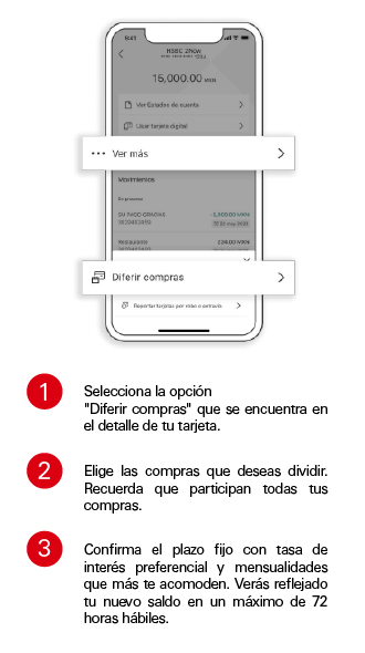 Aplica un plazo de 6, 9, 12, 18 o 24 meses para las compras realizadas en giros de salud (por ejemplo: Hospitales, farmacias, médicos, laboratorios), gastos funerarios, automotriz (por ejemplo: talleres, agencias y autopartes), hogar (por ejemplo: Materiales de Construcción, Servicios de Albañilería, Plomería, etc.), mascotas (por ejemplo: clínicas y hospitales veterinarios, Tiendas de Mascotas), Educación (por ejemplo: pagos de escuelas, universidades y academias), Asesoría legal y aseguradoras. El monto mínimo de compra debe ser de $1,000 M.N. y hasta el monto total de la compra realizada. Para diferir las compras se debe llamar al 55 5721 1168 opción 5 o ingresar a Banca por internet en el módulo de “Administrar” puede solicitar la promoción en el Centro de Contacto de HSBC al teléfono antes mencionado. En todos los casos se recomienda registrar las compras en la promoción entre 3 y 5 días antes de la fecha de corte de la tarjeta. No aplica en disposiciones de efectivo, transferencias de saldo, compras fuera de los giros previamente nombrados, ni otros planes de pagos previamente adquiridos. Tampoco son elegibles las transacciones (compras) que presenten un reverso o devolución a la Tarjeta de Crédito HSBC participante, así como las reclamadas como aclaración ante la institución.
